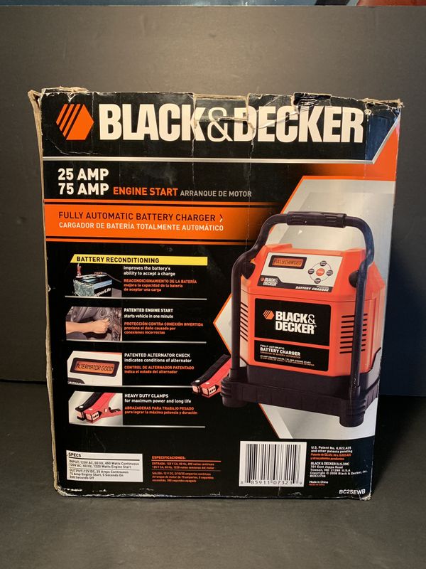25amp battery charger battery charger pdf manual download. The black decker 25 amp battery charger maintainer can be used with any agm gel or wet automotive or marine 12 volt battery and restart most vehicles with patented 75 amp engine start. It features a simple selector dial for easy operation which allows dialing into a function and letting the charger do the rest which ensures longer life for the battery. 25 amp smart fully automatic battery charger with 75 amp engine start.
